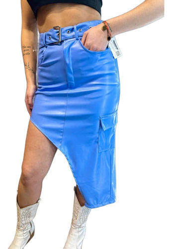 Pollera larga midi engomada elastizada irregular cargo con cinturon.