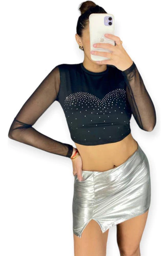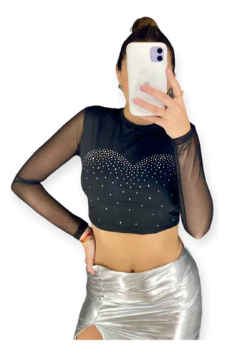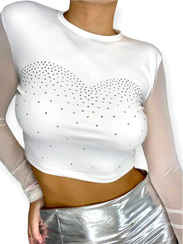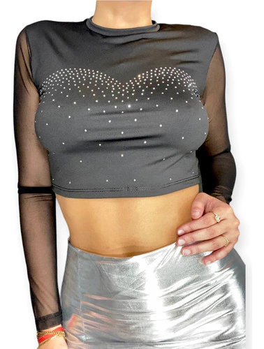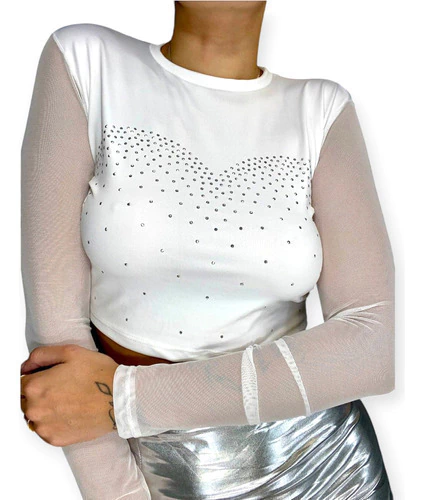Remera crop top de lycra microfibra con mangas de tul y apliques de strass.